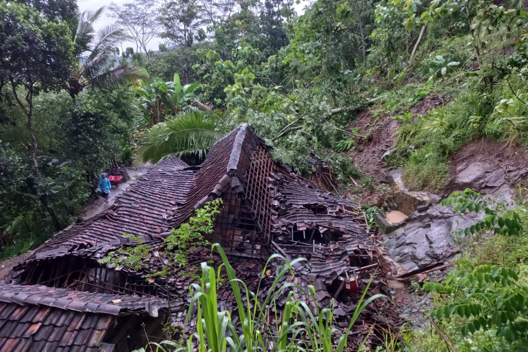 GEDANGSARI ( Wartahandayani.com ) _ Rumah limasan semi permanen ukuran 8mx12m milik Maryadi (45) warga Padukuhan Suruh Rt. 01/Rw.12, Kalurahan Hargomulyo , Kapanewon Gedangsari roboh akibat longsoran tanah. Selasa14/02/2023